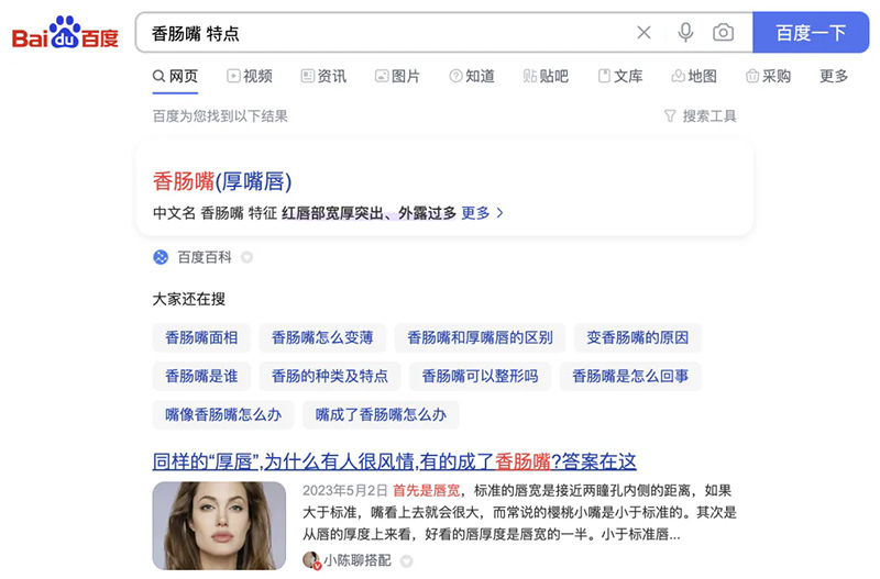 什么是搜盡奇峰打草稿?說通俗一點,就是找參考,總結規律、找到特點,然后用在自己的設計當中。搜盡奇峰打草稿最簡單的方式是什么?只要你在百度的搜索框里面打上這個問題的關鍵詞,如“香腸嘴特點”,就能搜索出多個特點。