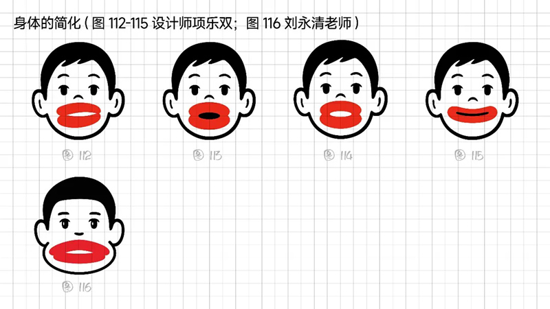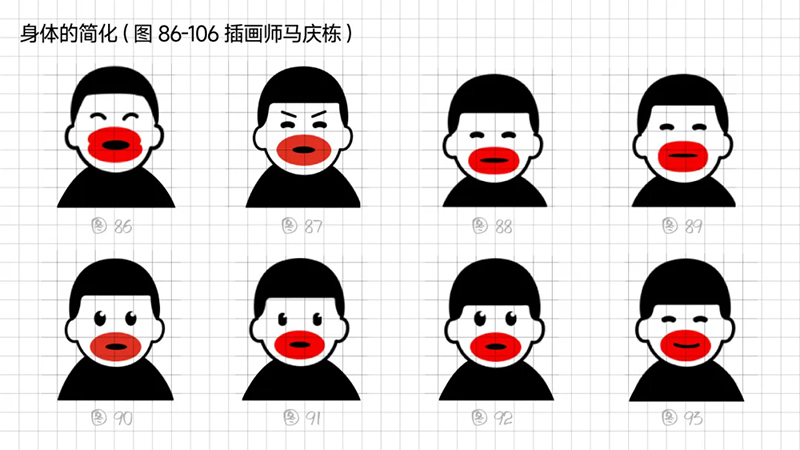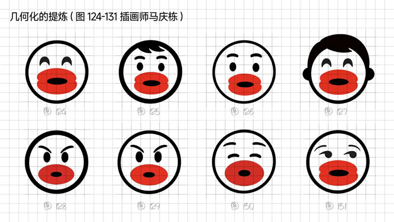 4)去外輪廓的改變:堅持簡化思路,那能不能更加簡練呢?可以把能識別出臉所有元素簡化、虛化、甚至刪除嗎?嘗試只保留眼睛、眉毛、嘴巴,就能識別。但是去掉外輪廓的表現手法,會使得整體圖形顯得散。