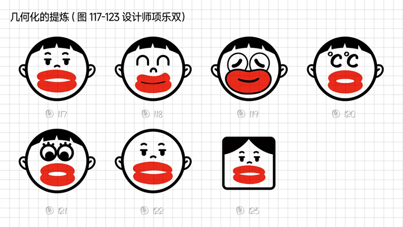 3)幾何化的提煉:眼睛、眉毛、鼻子被縮小在一個杯子上,作為單色使用時,一定會模糊掉很多細節,導致最終呈現的效果大打折扣。進一步簡化符號中的單個元素,進行五官元素的提煉,去眉毛、去鼻子、去發型細節、把面部概括為一個標準圓形。同時發現這種處理手法給人一種距離感,不夠接地氣,缺乏一點親切感。提煉與簡化也需要掌握一個平衡。
