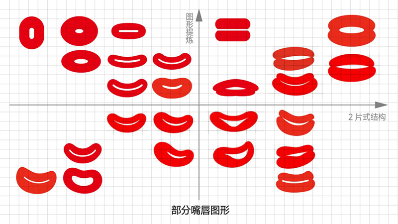 5)嘴唇圖形的提煉:進行了寫實、概括、提煉、變化的不同嘗試,我們重新整理復盤,嘴唇的簡化圖形,從構成上主要分成2種,是2個橢圓,還是3個橢圓的變形(下圖)。